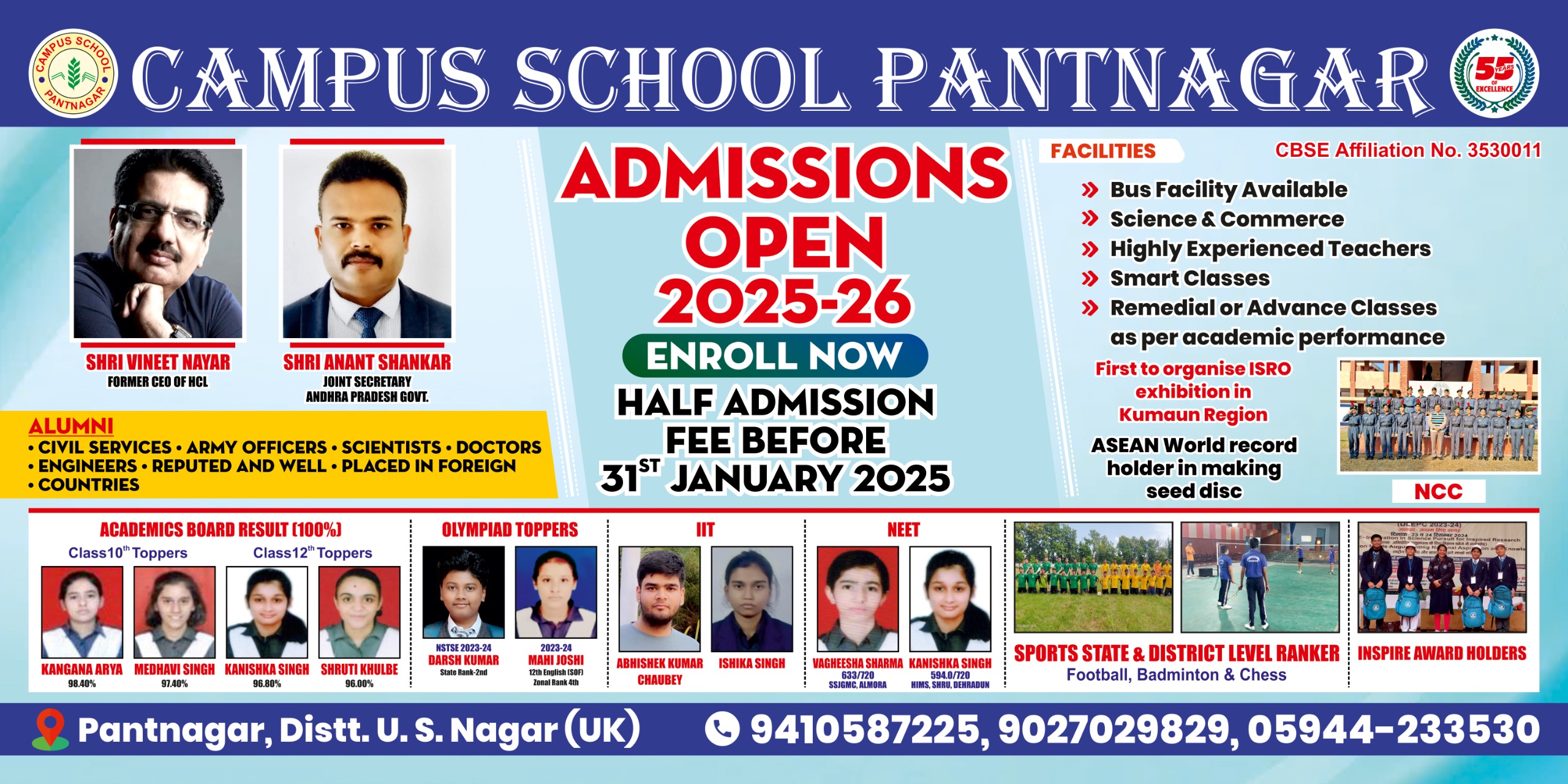 The courses of study are devised with the aim that students can take their secondary and Sr. School Certificate Examination of the Central Board of Secondary School Education according to the 10+2 system of education at the age of 16 and 18 respectively. The school is following the latest education system devised by CBSE up to class X. For the students of class XI and XII the school provides Science Stream and Commerce Stream which are strong demand in the campus to appear in the entrance exam of IIT, JEE, NEET, G.B.Pant University of Agriculture and Technology Entrance Exam etc.